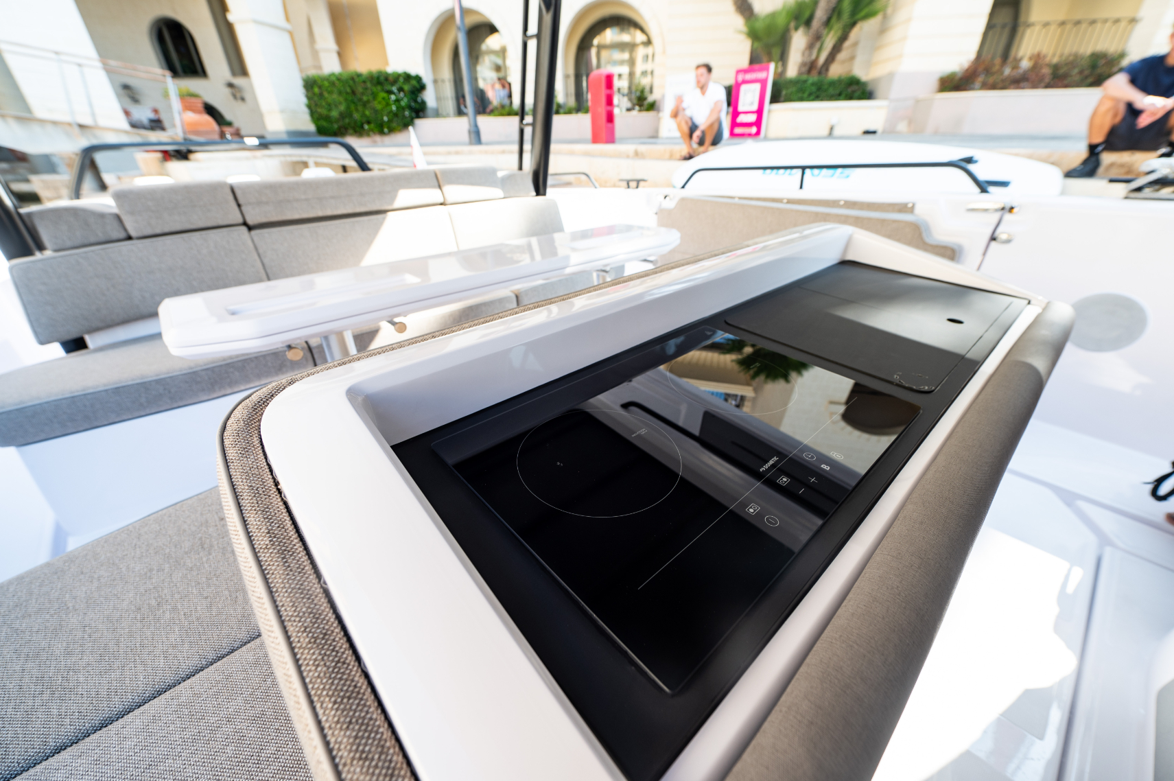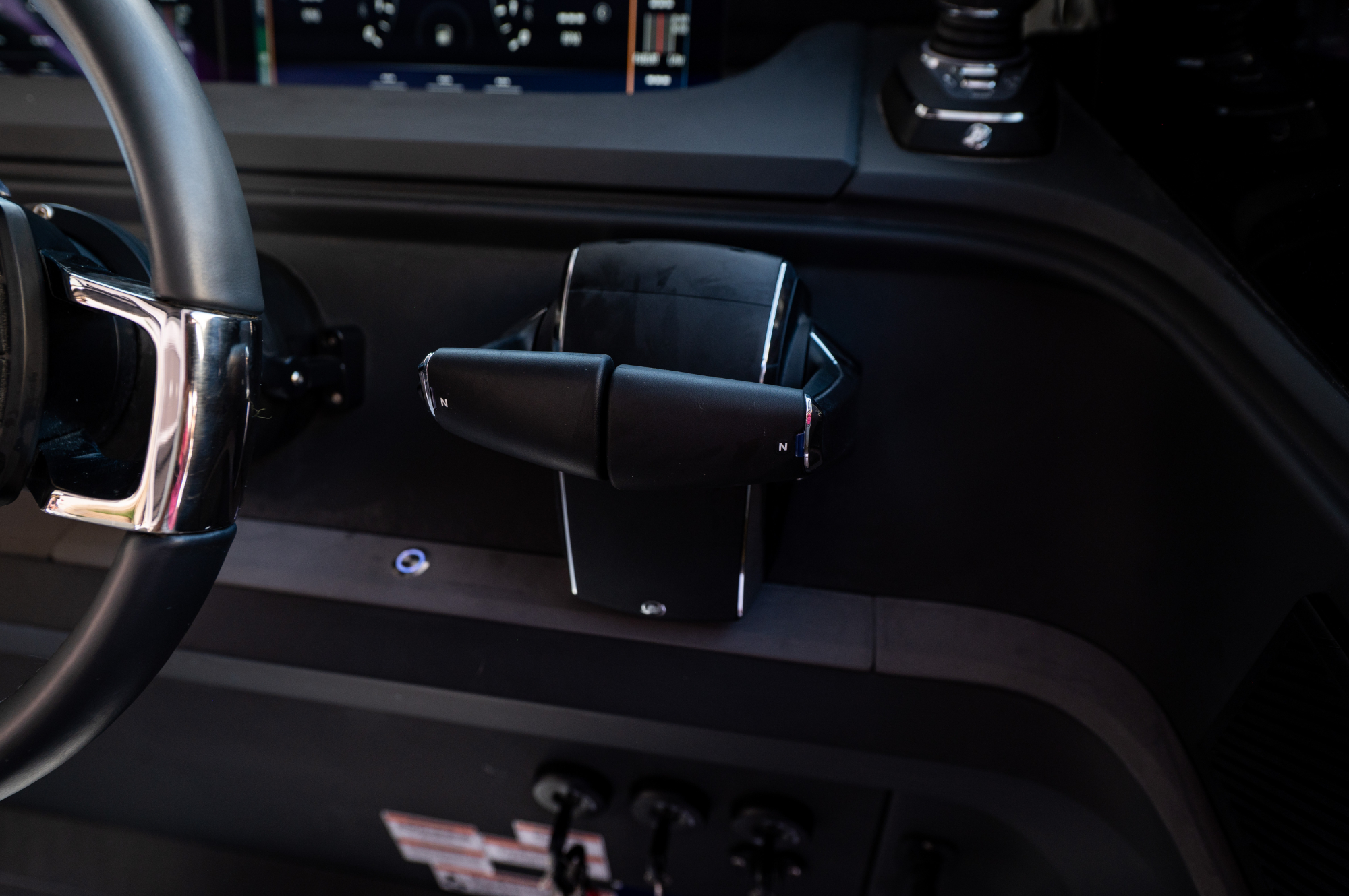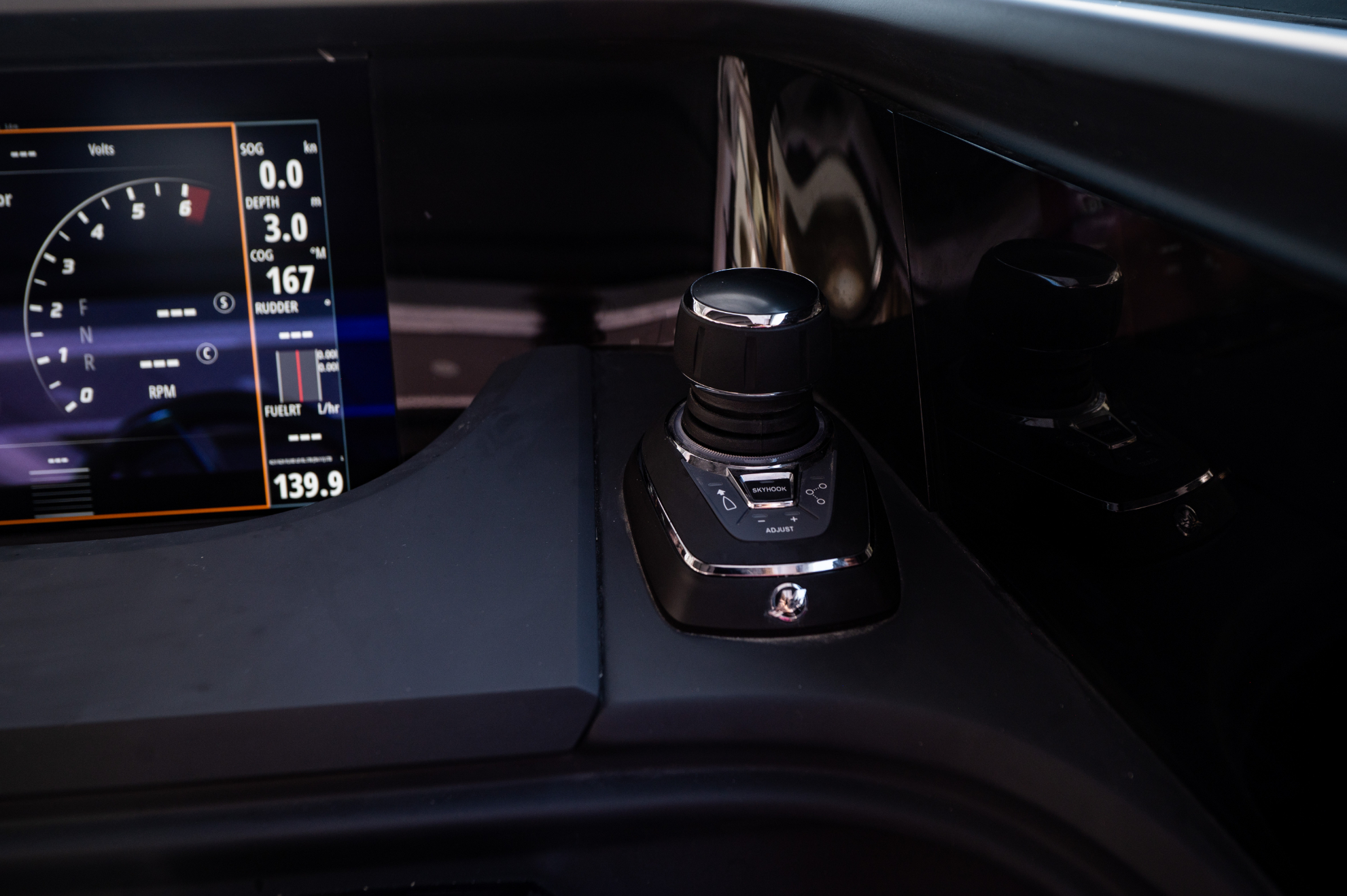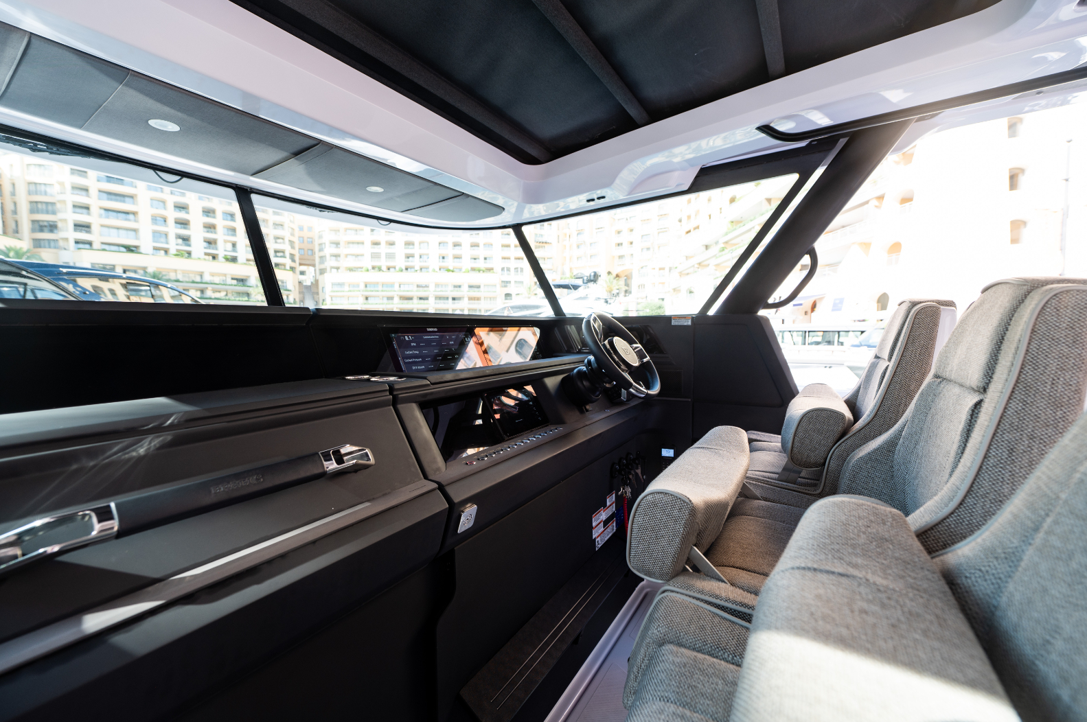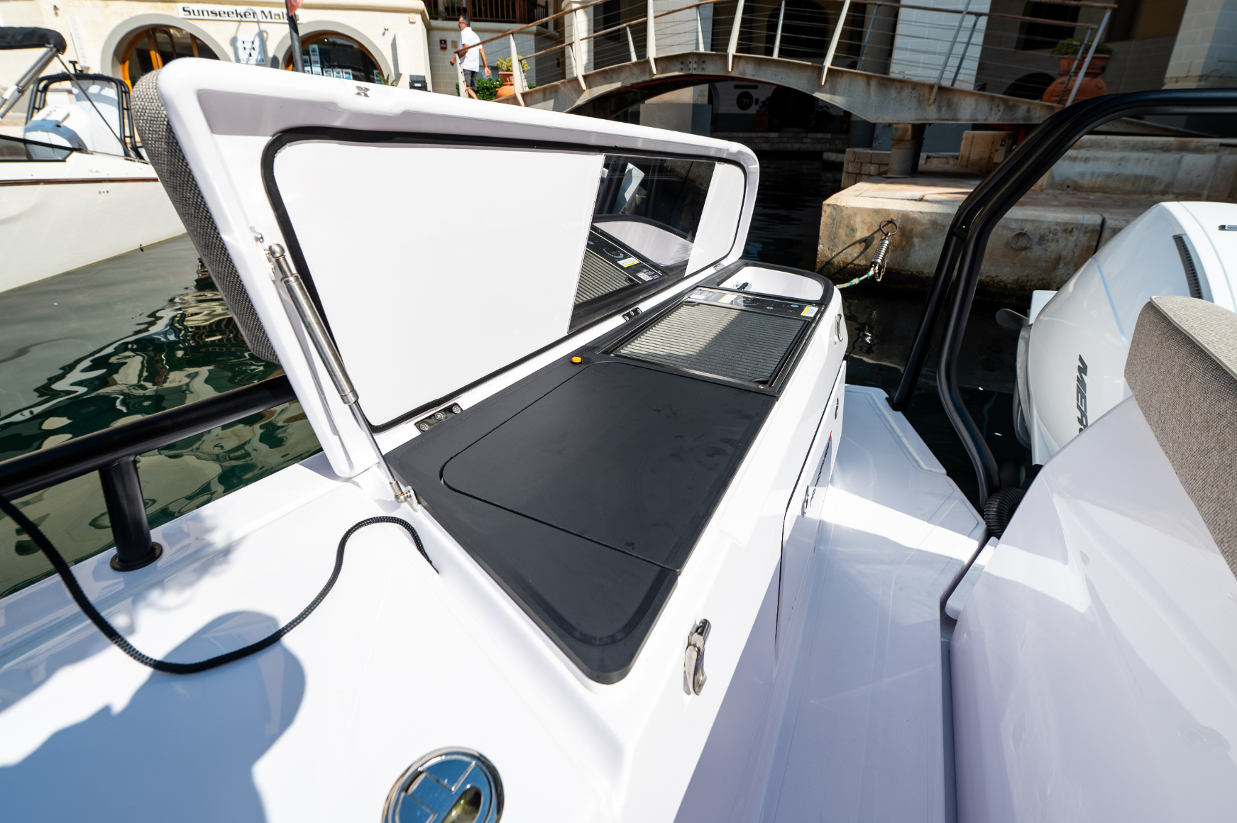 Dual electrically operated canvas roofs with harbor covers. Upholstery in Silvertex Petrol with Seine piping. Foldable light mast in white painted aluminum with anchor light. Pilot and 2x co-pilots seats with flip-up bolsters and swivel base with two large drawers and remote battery switches in seat base. Wide aft sofa with storage units. Wetbar with sink and faucet and a 65l drawer refrigerator. Upholstered, aft-facing sofa around wetbar. Wide, foldable hi-lo table between aft bench and wetbar. Recessed led roof lights and hidden speakers. Integrated windscreen wipers with separate reservoir. Grabrails along both sides of the roof. Clean helm layout with control switch panel in glass with illuminated push switches. Simrad 2×12” glass bridge display. Intelligent steering module (ISM) steering wheel in leather with integrated controls for audio, trim tabs and bow thruster. Integrated windscreen wipers with separate reservoir. Lockable access hatch to front cabin with grab rail in leather. Fire and CO2 alarms.