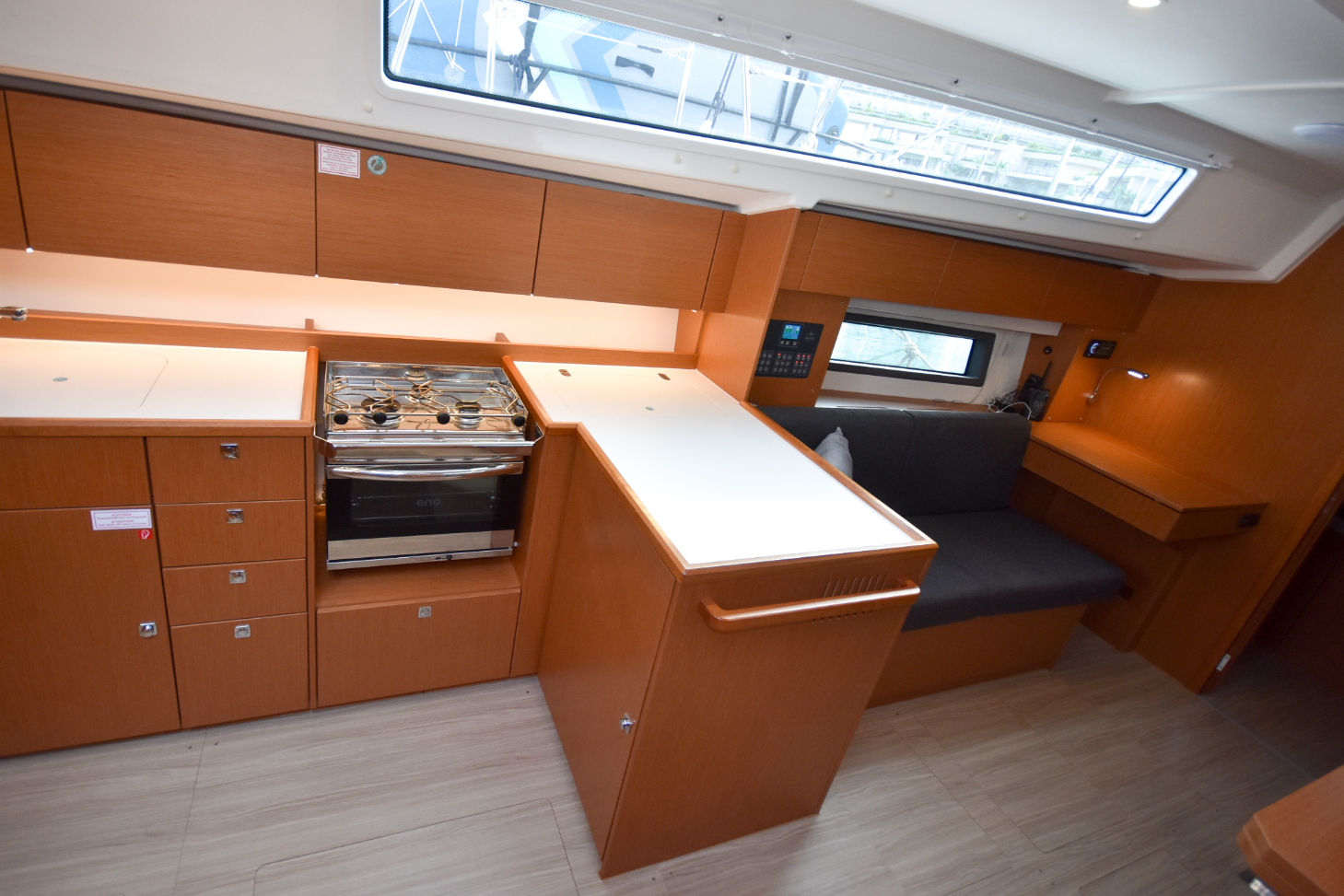 • L-shaped galley on portside with washbasin, 110 L fridge, and 3-burner gas stove
