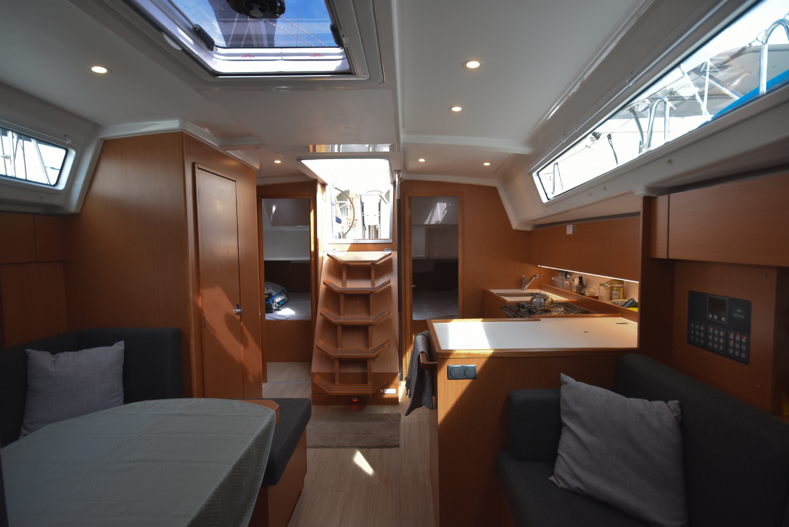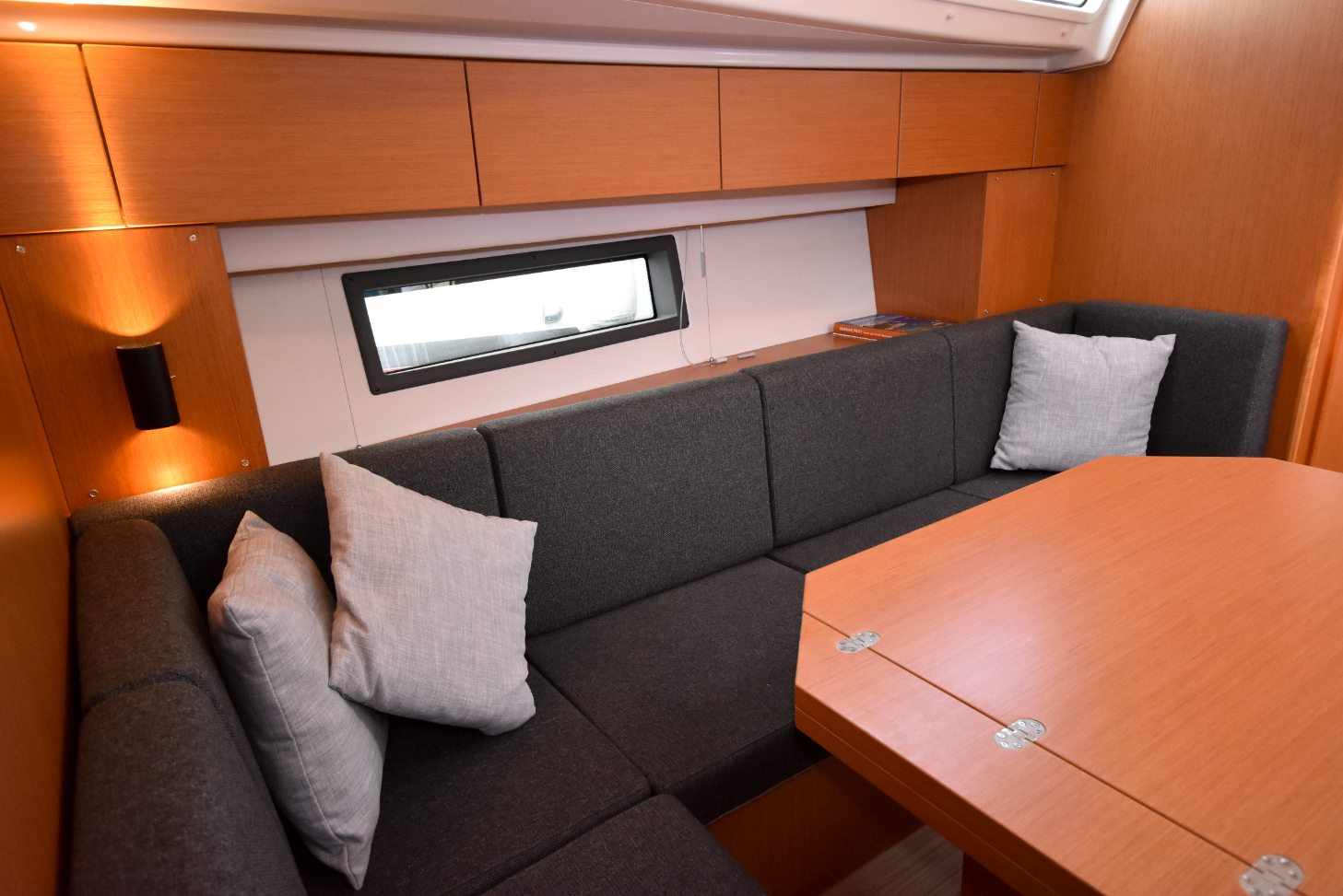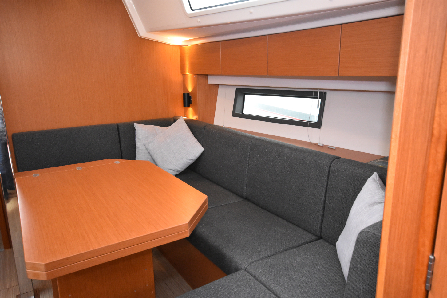• Salon with dining area on starboard and sofa with a chart table on portside