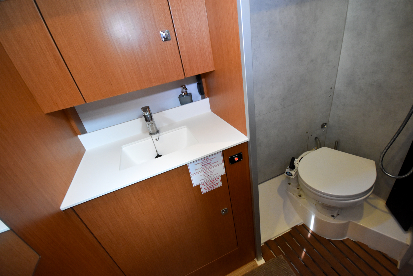 • Master cabin with separate head (incl. washbasin, toilet, and shower function),