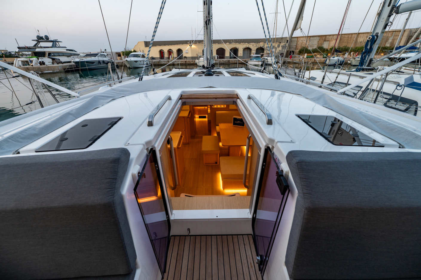 “Deck flush hatches, 8 x, openable, for cabins, heads and salon.