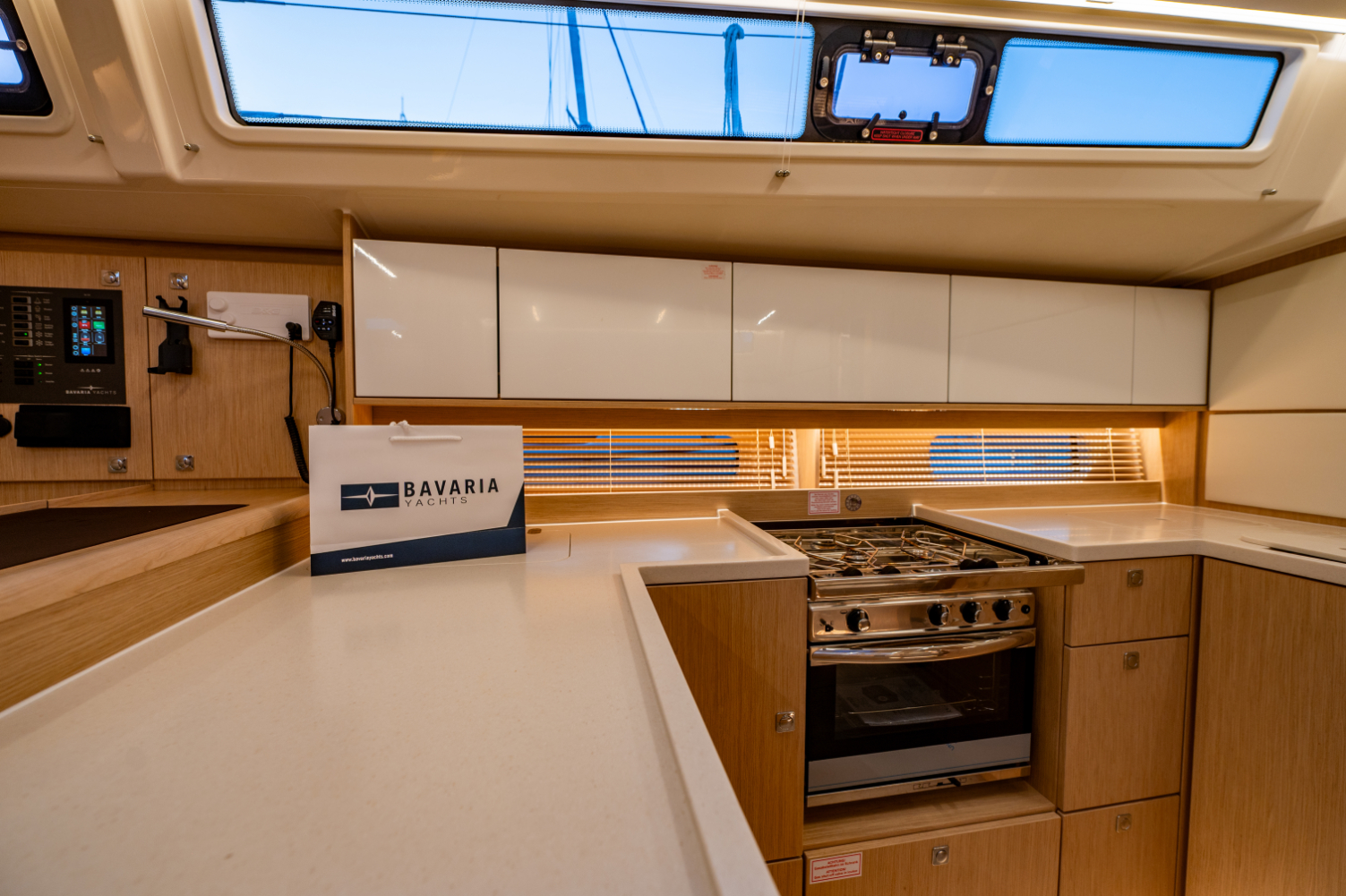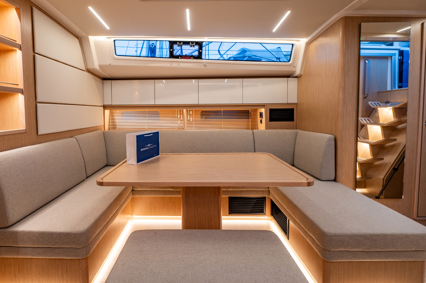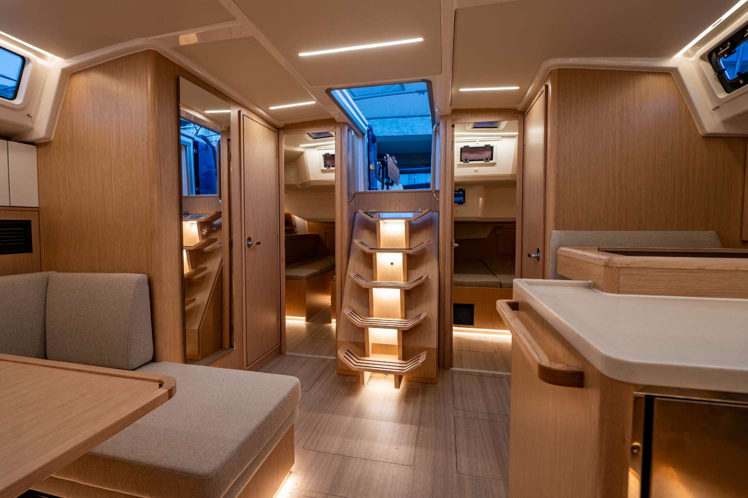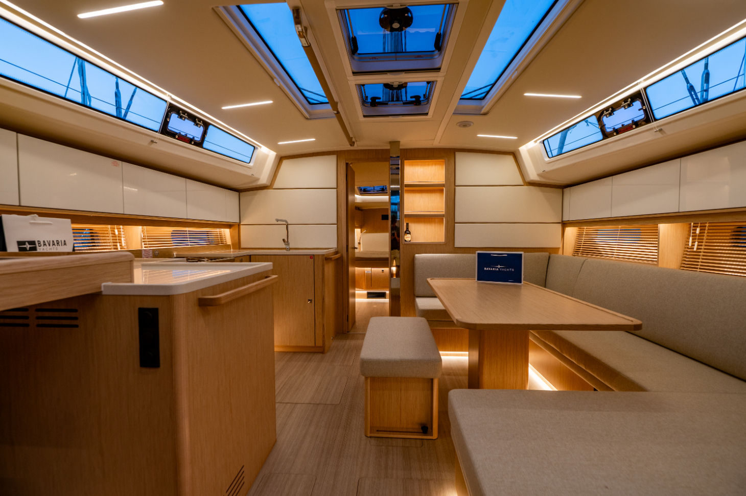 Ambient lights in ceiling panel and below upper cupboards in salon and cabins