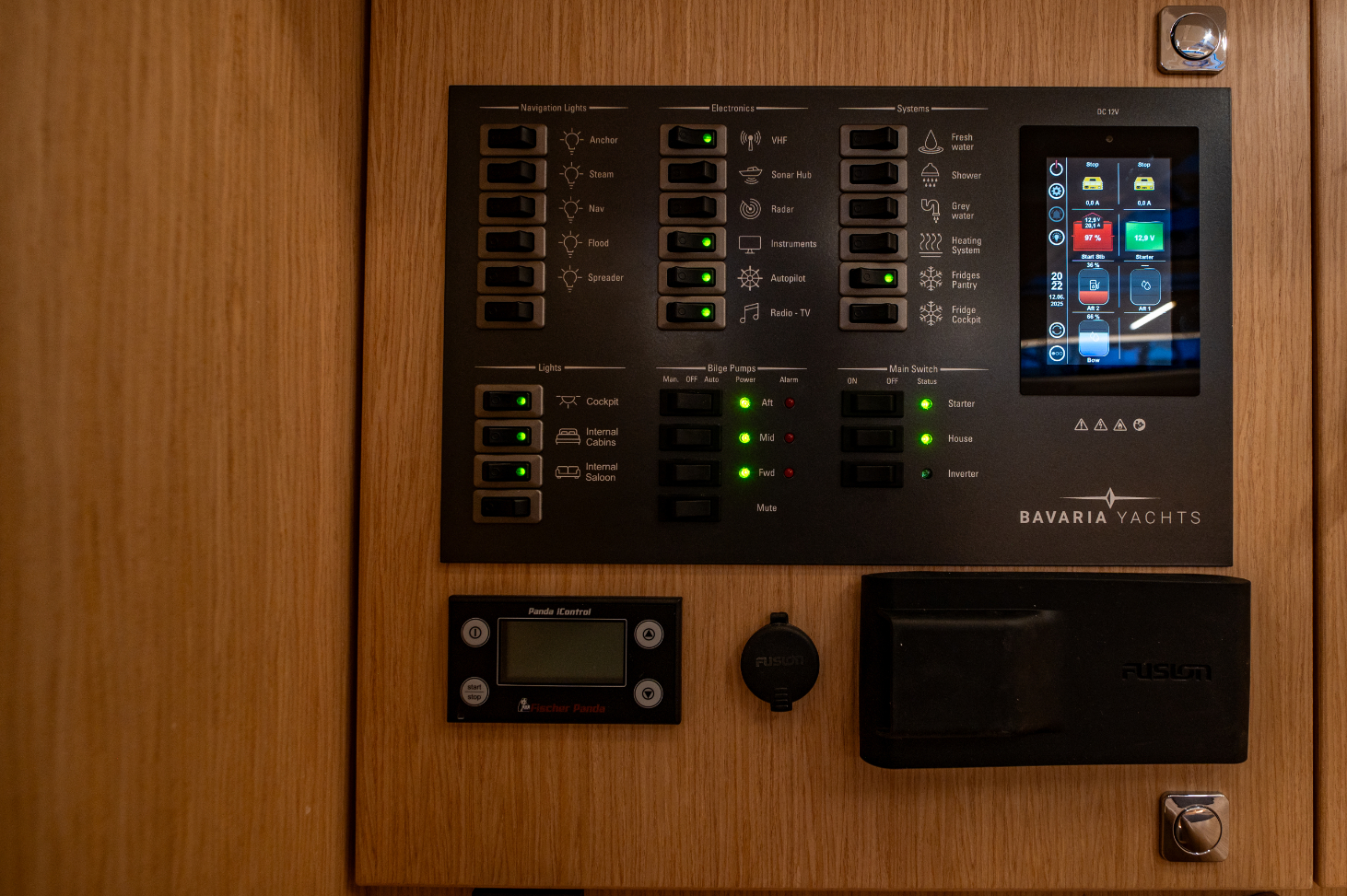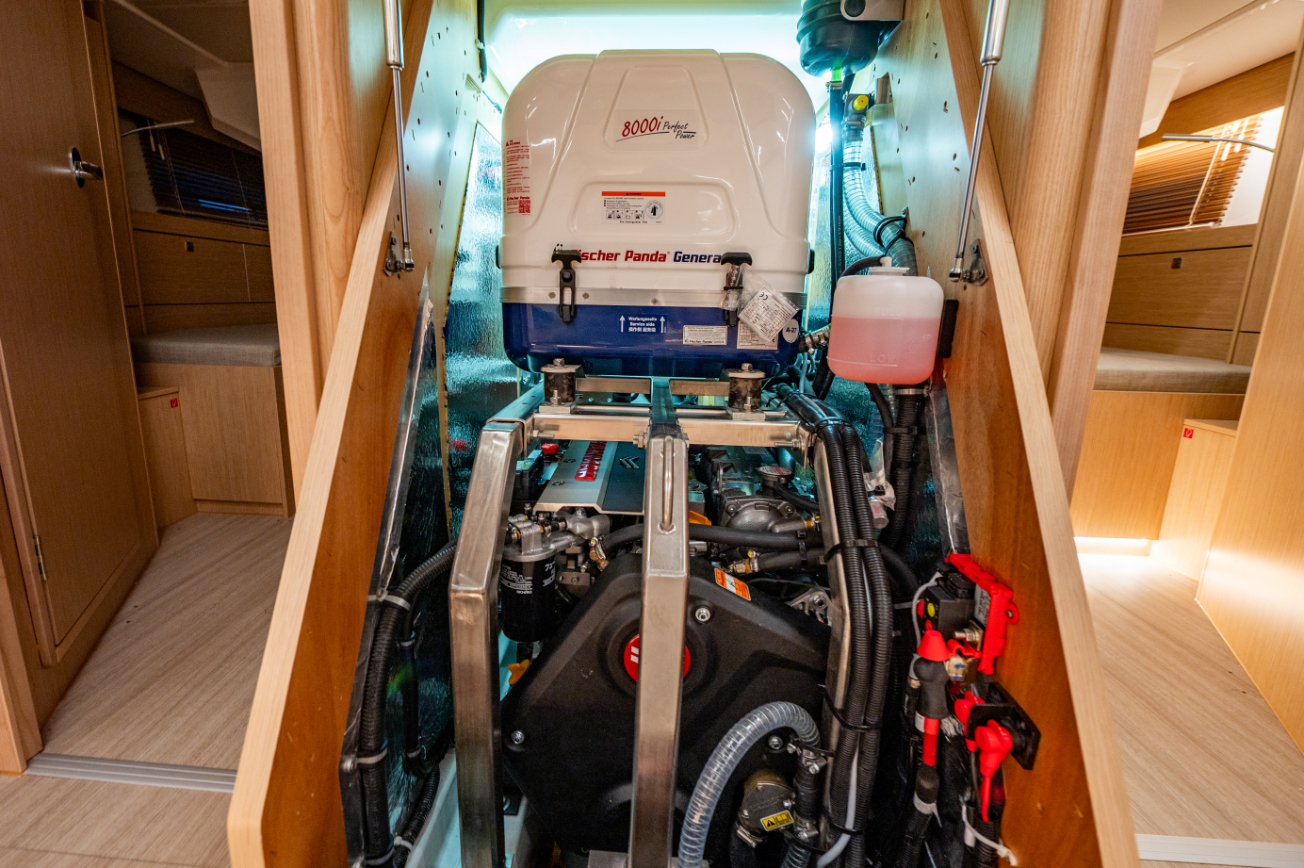 Main panel, 230 V socket in each cabin and head, in pantry and at chart table