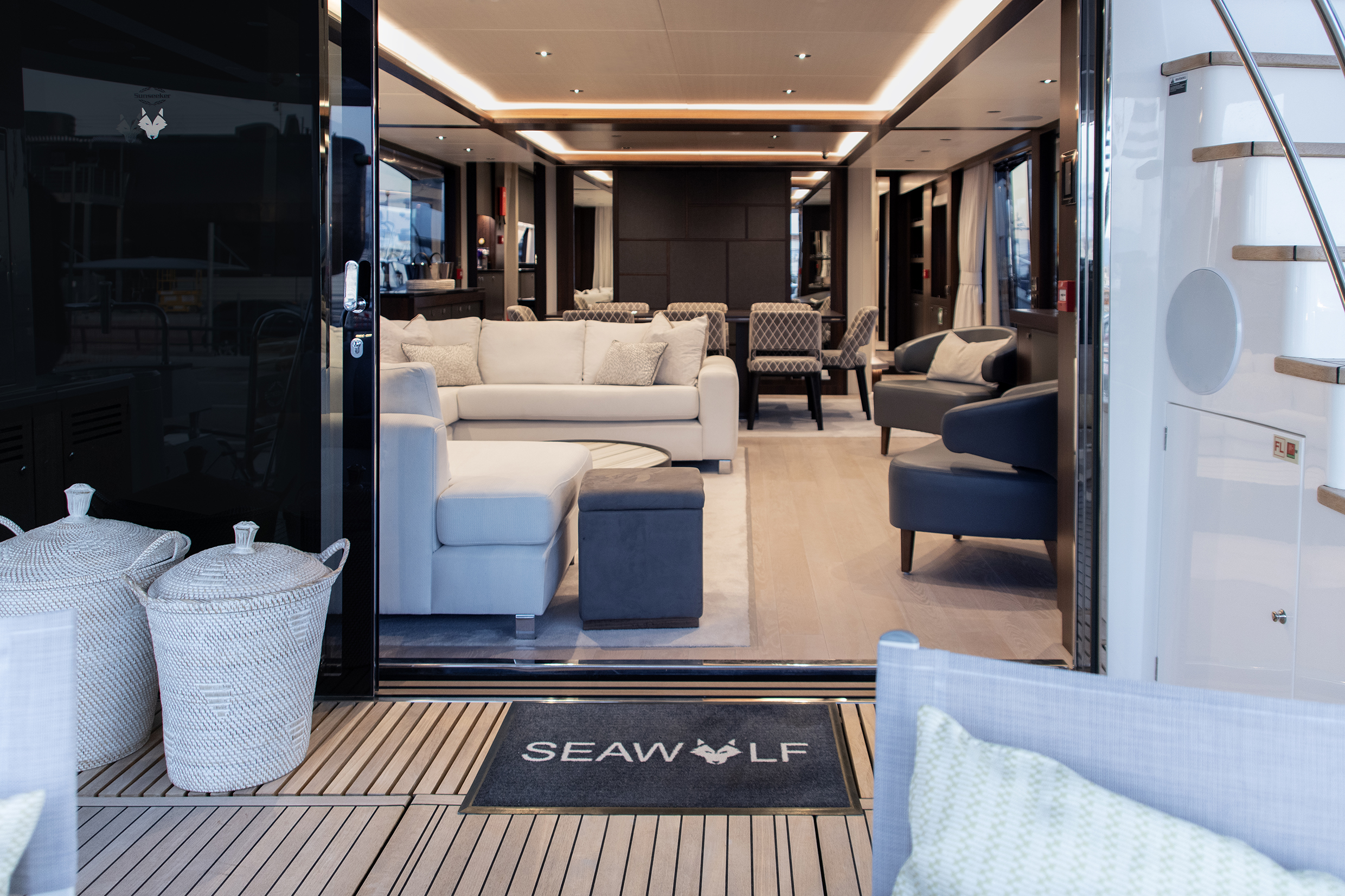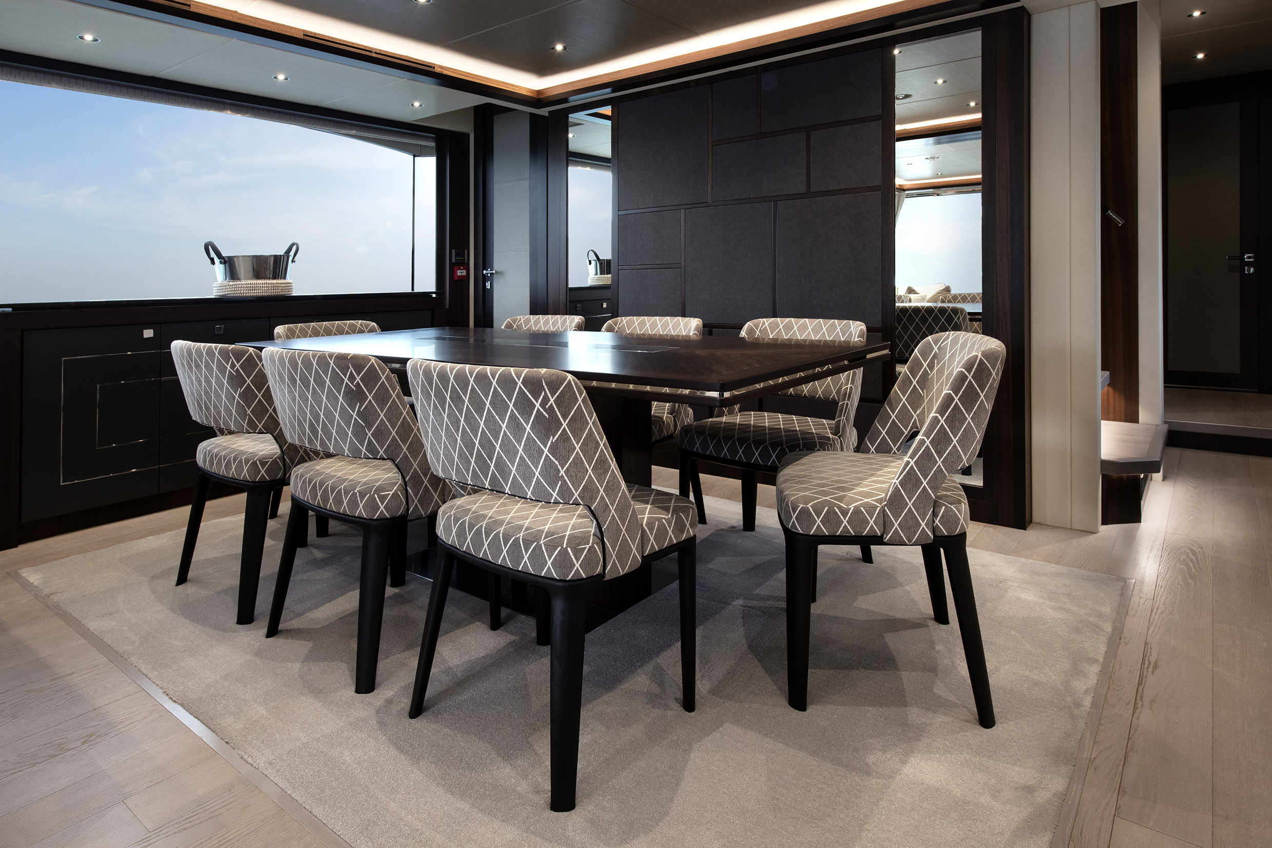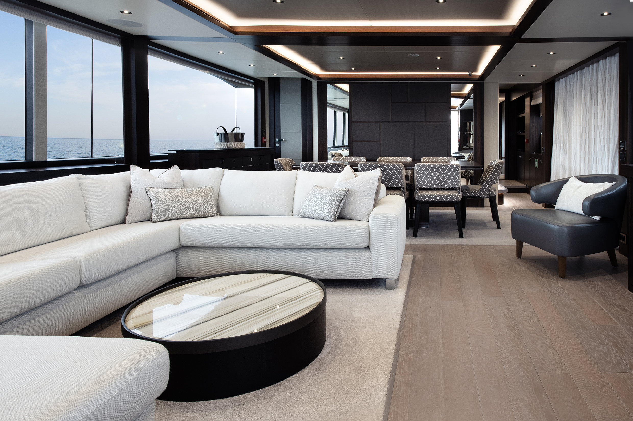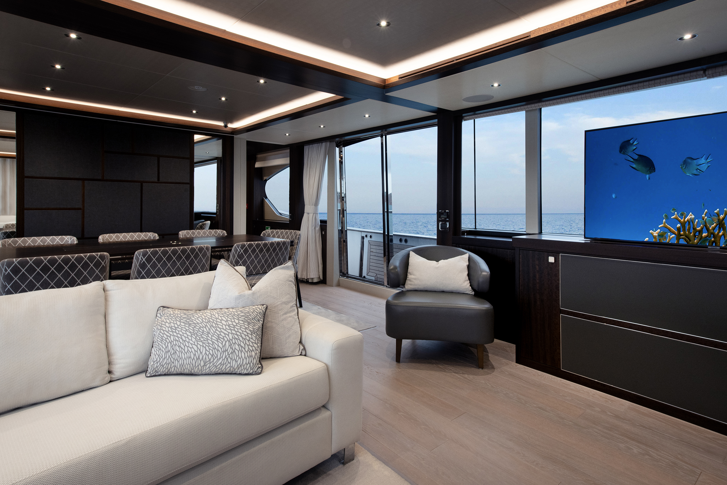 The main deck features a light-filled salon with floor-to-ceiling windows, plush seating, and a seamless flow to the aft deck, creating an ideal setting for entertaining or relaxing at sea.