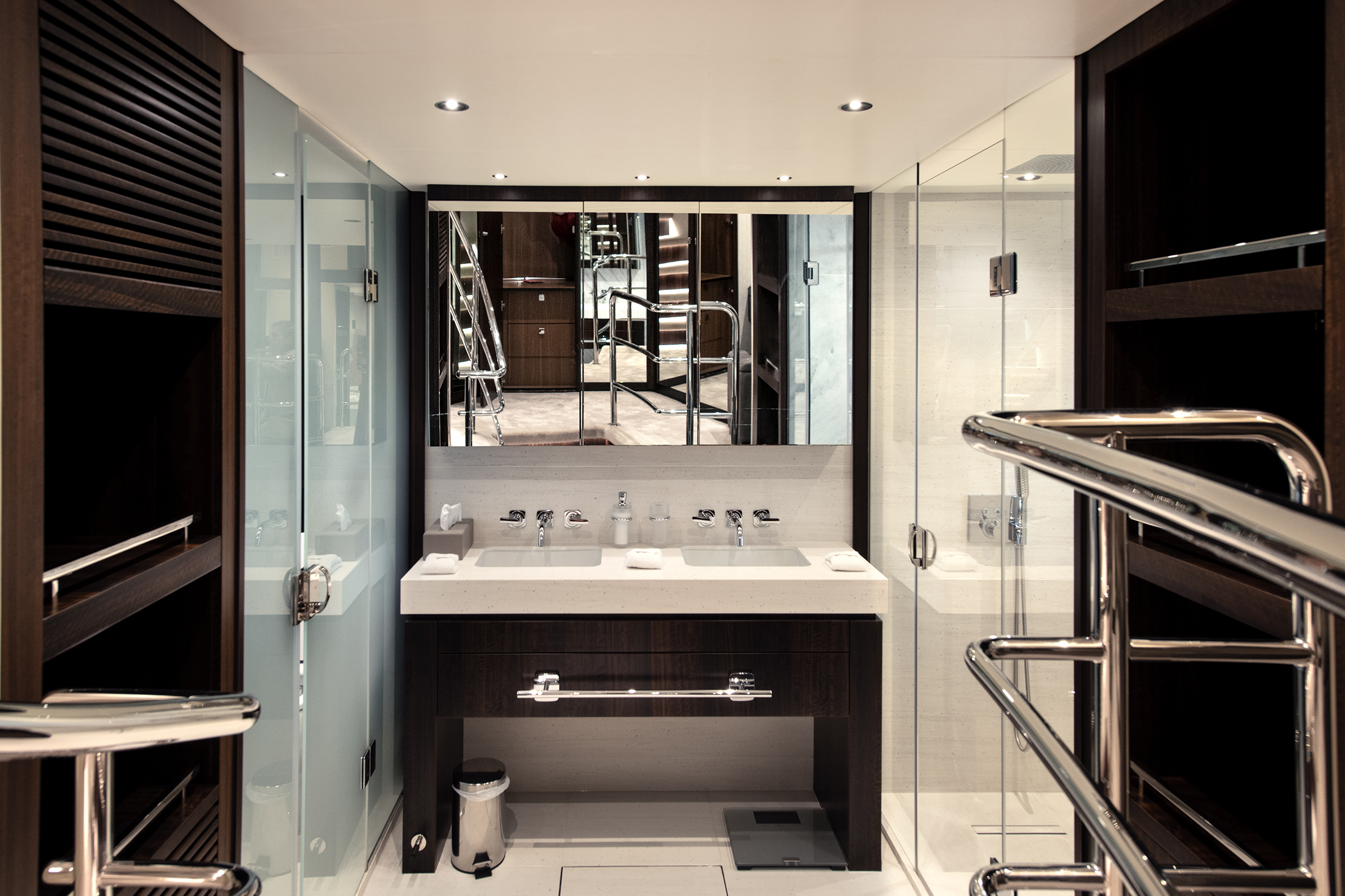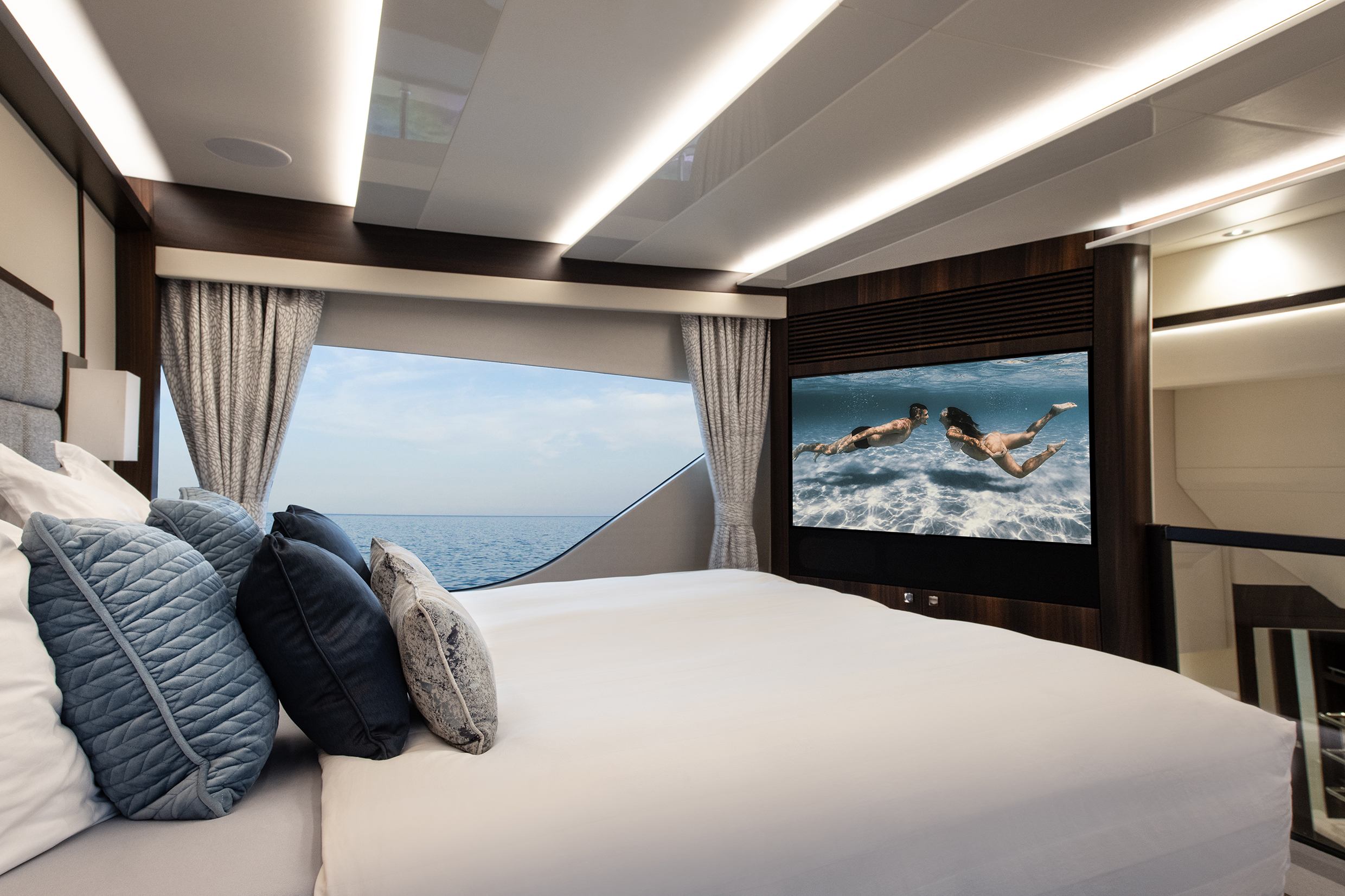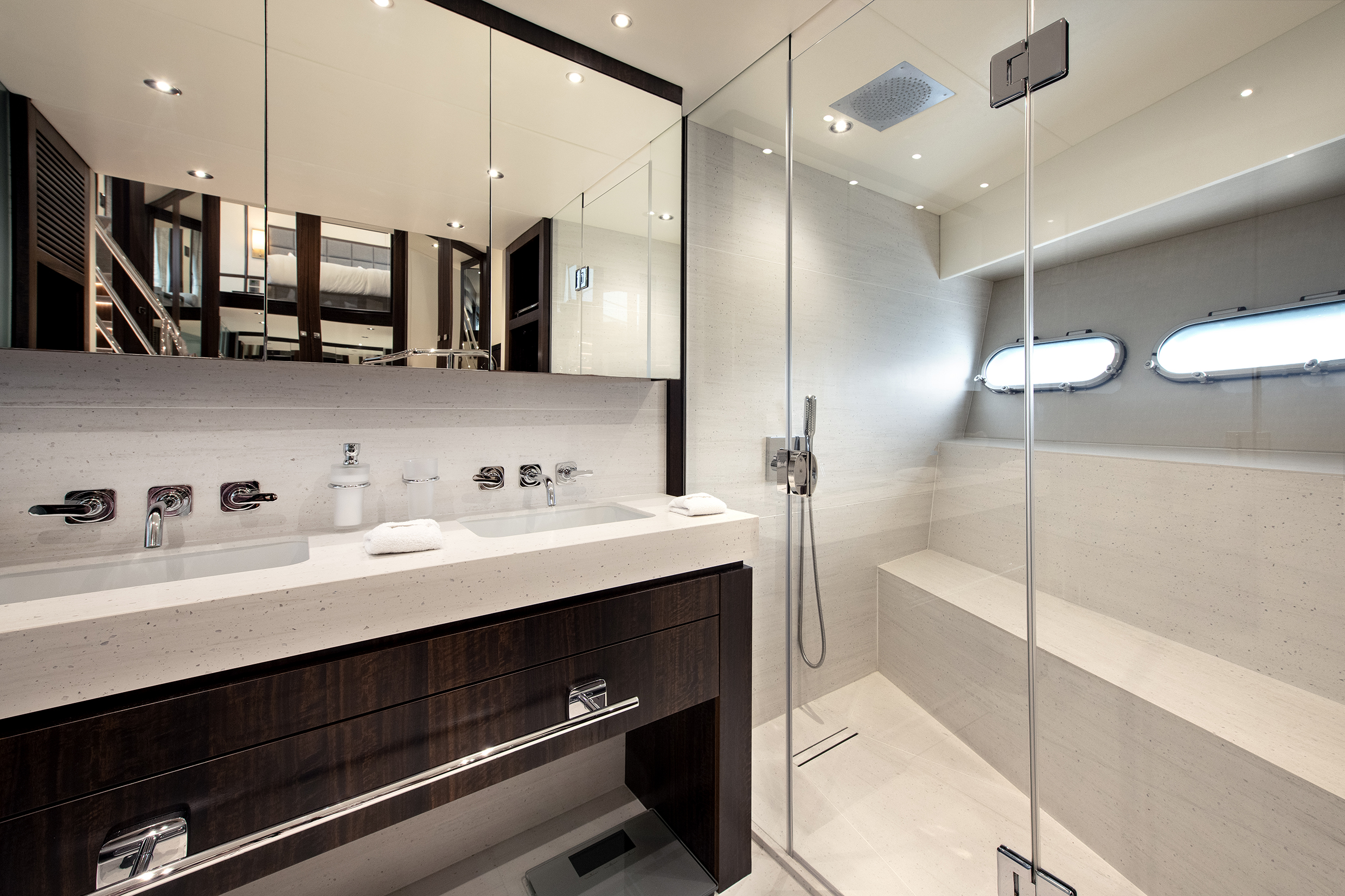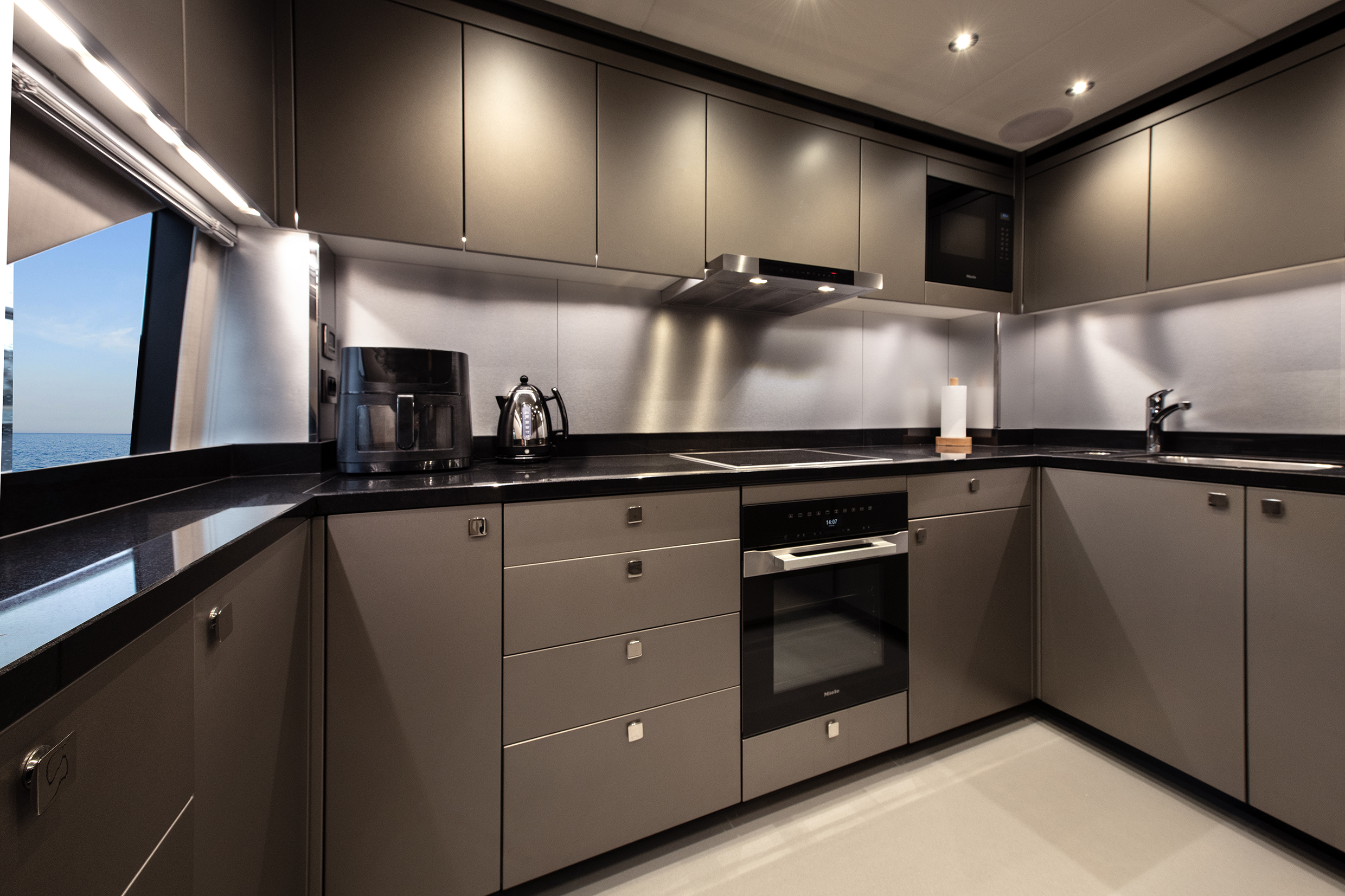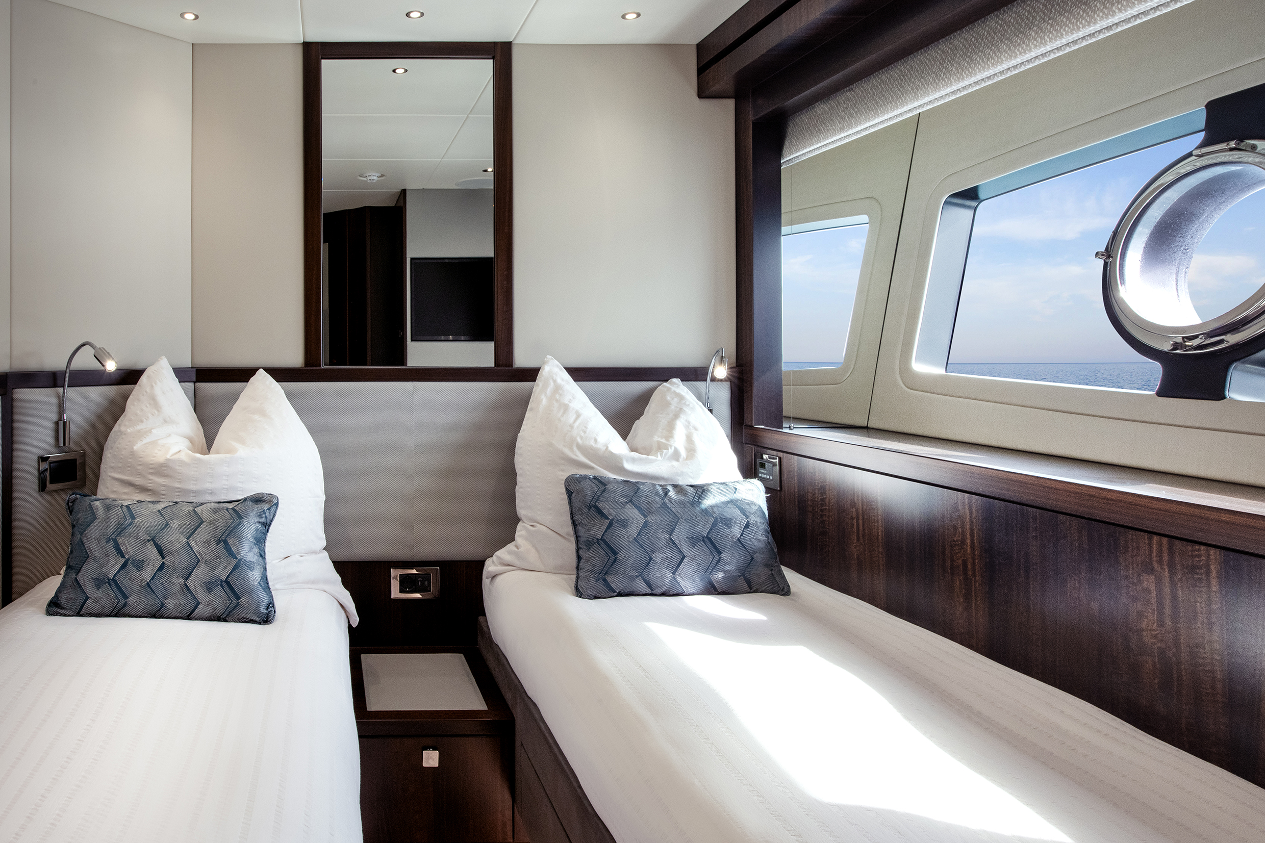 Guest cabins, located below, are equally refined, each with ensuite facilities and generous storage, ensuring comfort for extended cruising.